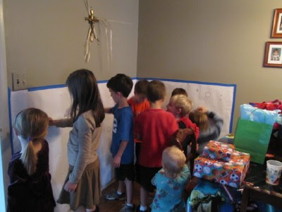 Our guest arrived promptly at 3 and they began a coloring activity. The Man had brought home some large plotter paper from work, so I made a moral of sorts in the corner of the living room for the kids to color and draw on.